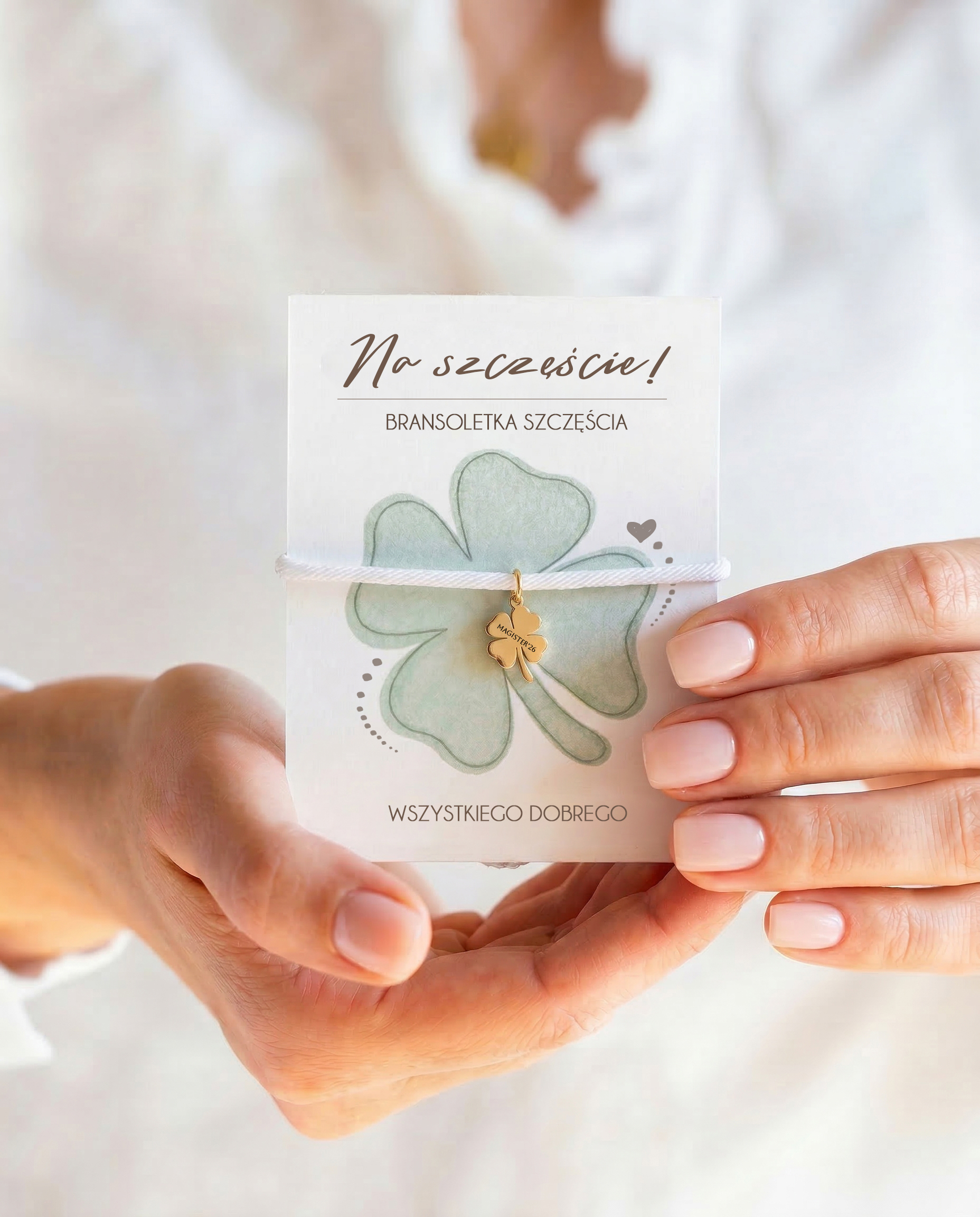 W zestawie ozdobna karteczka z napisem: „NA SZCZĘŚCIE - BRANSOLETKA SZCZĘŚCIA - WSZYSTKIEGO DOBREGO”